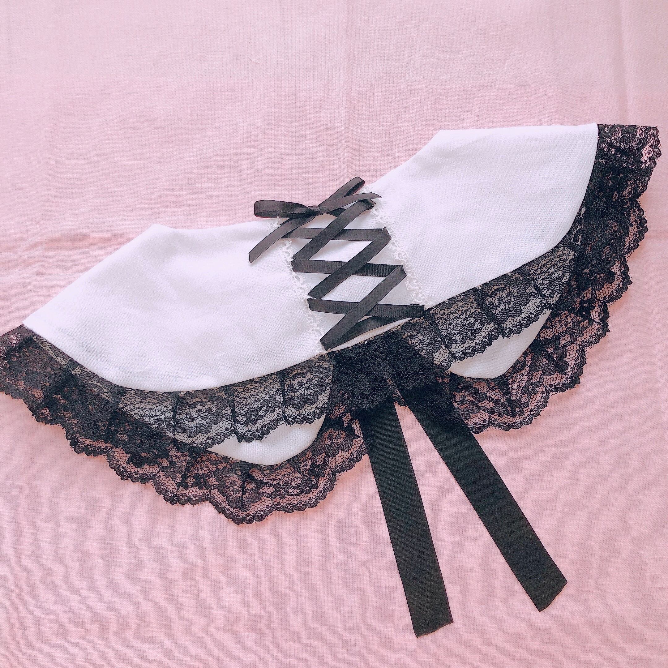 白×黒 レースアップ リボン 丸襟レース付け襟