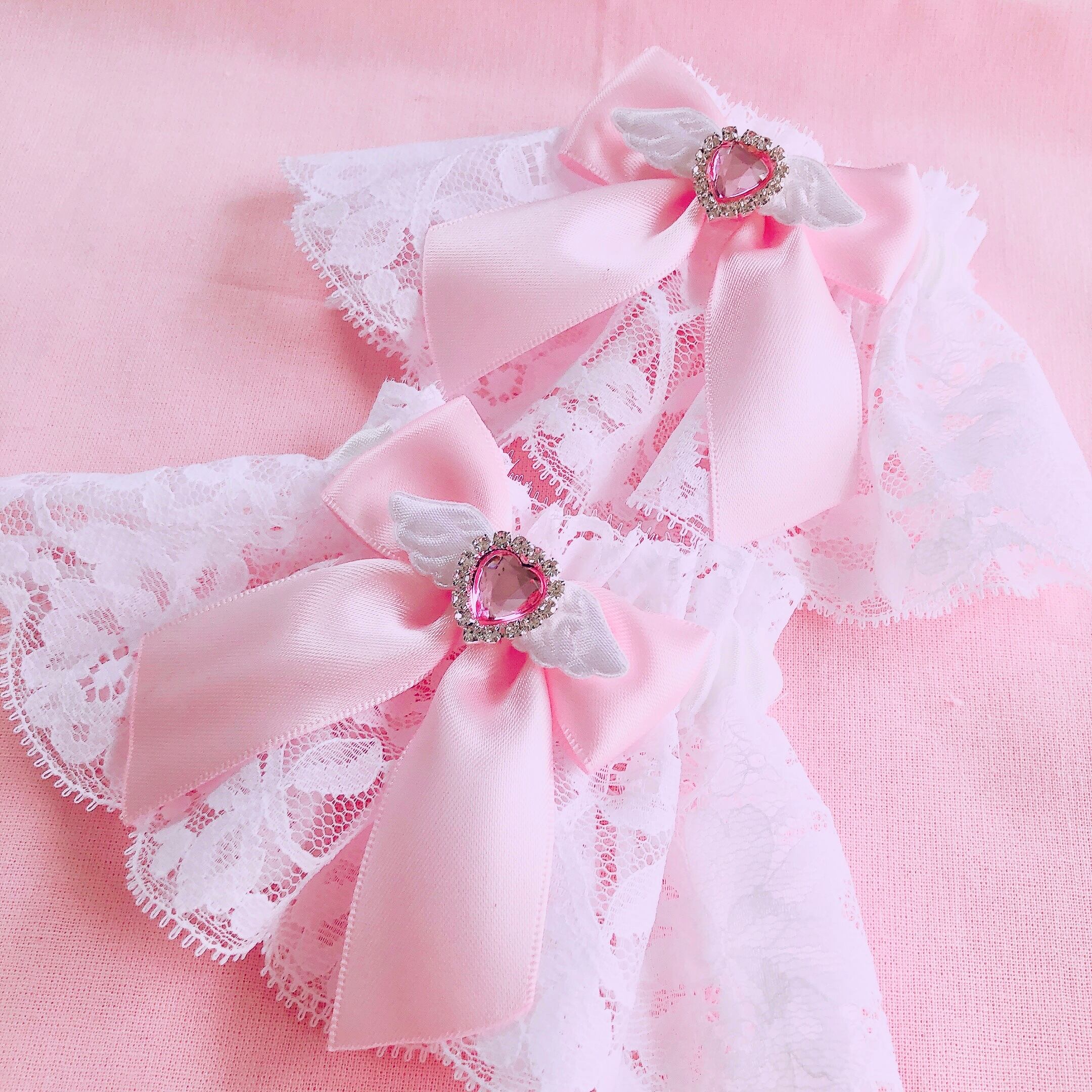 ピンク天使の羽×ハートストーンレースお袖留め ロリータ 量産型 コンカフェ メイド